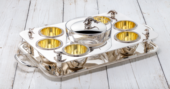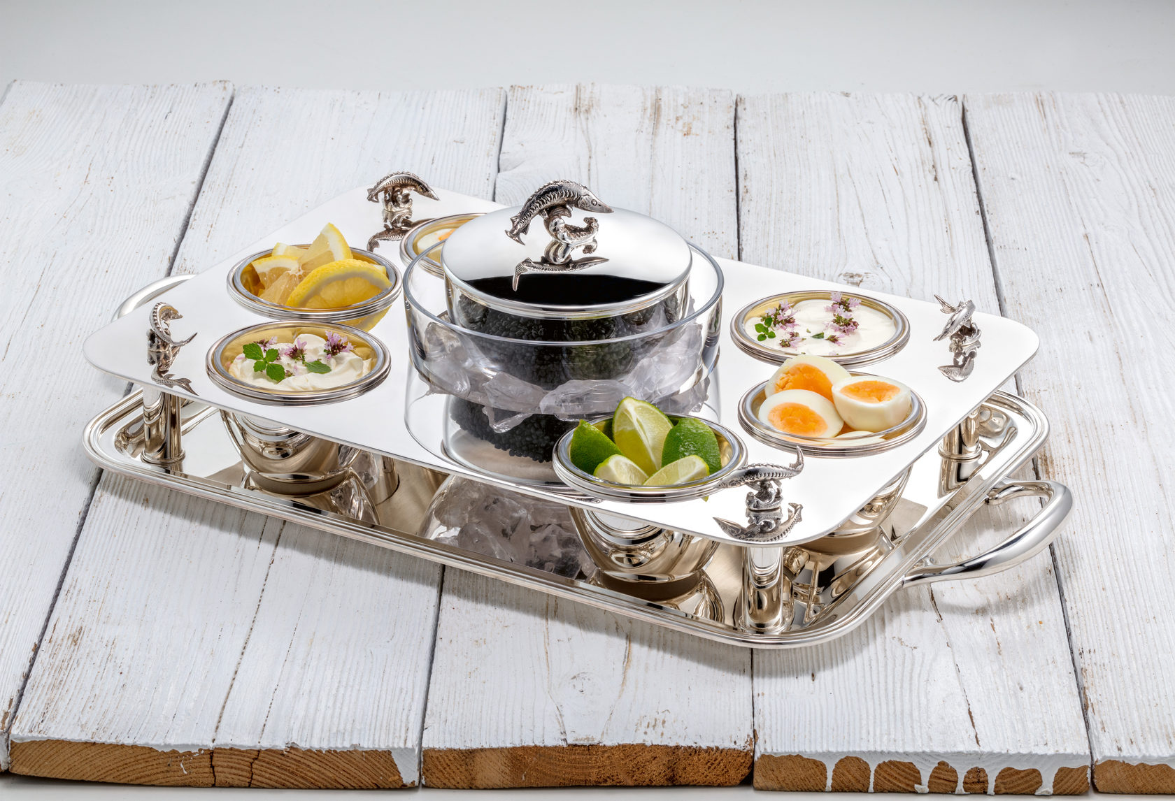 وعاء فضي مطلي بالذهب من الداخل، مزود بإضافات كريستالية بقطر 9.8 سم وارتفاع 6.0 سم، وعاء كريستالي متوسط للثلج بقطر 17.0 سم، وعاء بغطاء داخلي «ستور» بقطر 13.0 سم، وصحن فضي بحافة مزخرفة